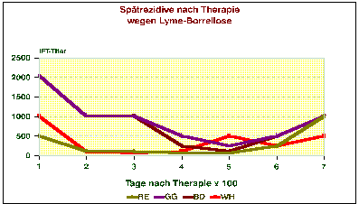 Nach (erfolgreicher) Therapie einer Borrelieninfektion klingen die Antikörper langsam ab. Dabei besitzen IFT-gemessene Titer eine andere zeitliche Kinetik als EIA-gemessene. Grundsätzlich hängt das davon ab, welche Proteine der Test erkennt. Erkennt er nur Flagellin, hat er eine andere Abklingkurve, als wenn er OSP A/B oder das 94 KD-Protein erkennt. Man kann also nur für jeweils identisch präparierte Tests eine Kinetik angeben.