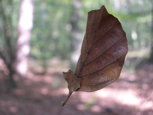 Im Wald hing ein einzelnes herbstliches Blatt an einem Spinnweb.